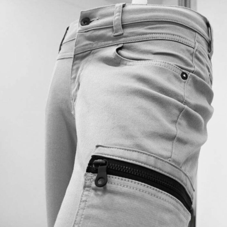 ニットデニムのような伸縮性を持った生地で作られたパンツ。ドビー織りを採用することにより、光沢感と独特の風合いをもつスタイルと、肌触りが柔らかく快適な着心地を生み出しました。
