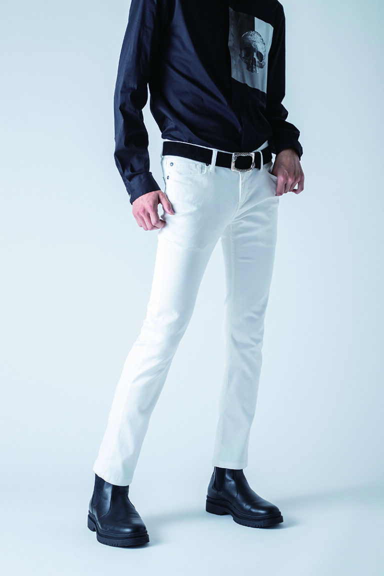 ニットデニムのような伸縮性を持った生地で作られたパンツ。ドビー織りを採用することにより、光沢感と独特の風合いをもつスタイルと、肌触りが柔らかく快適な着心地を生み出しました。
