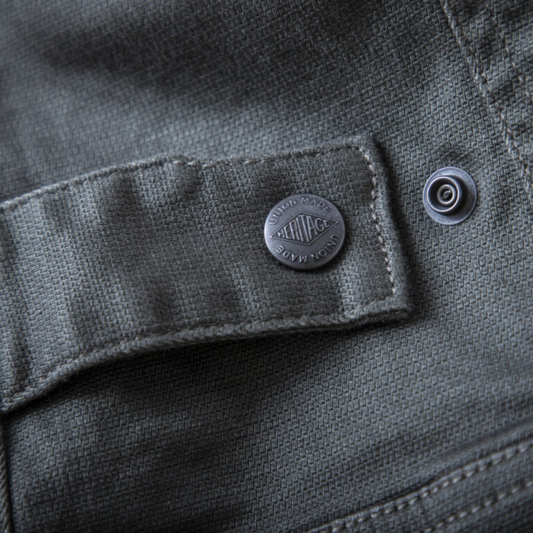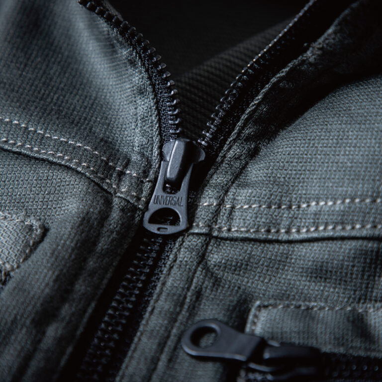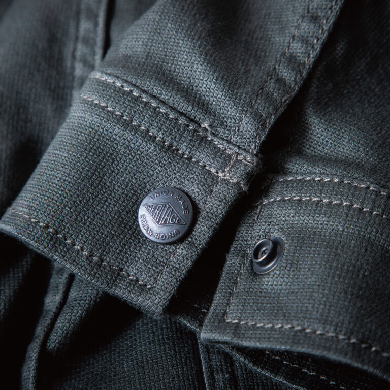 “OLD AMERICAN”(アメリカ製ヴィンテージジッパーを復刻したファスナー、リベッ ト、ドット釦)を使用し、”UNION MADE” と刻印されたリベット、ドット釦をあえて黒 塗料で塗装することにより、着用するほどに、生地と附属類がその使用感を演出し、経年変化をお楽しみいただけます。ファスナー、リベット、ドット釦は全て日本製を 使用。