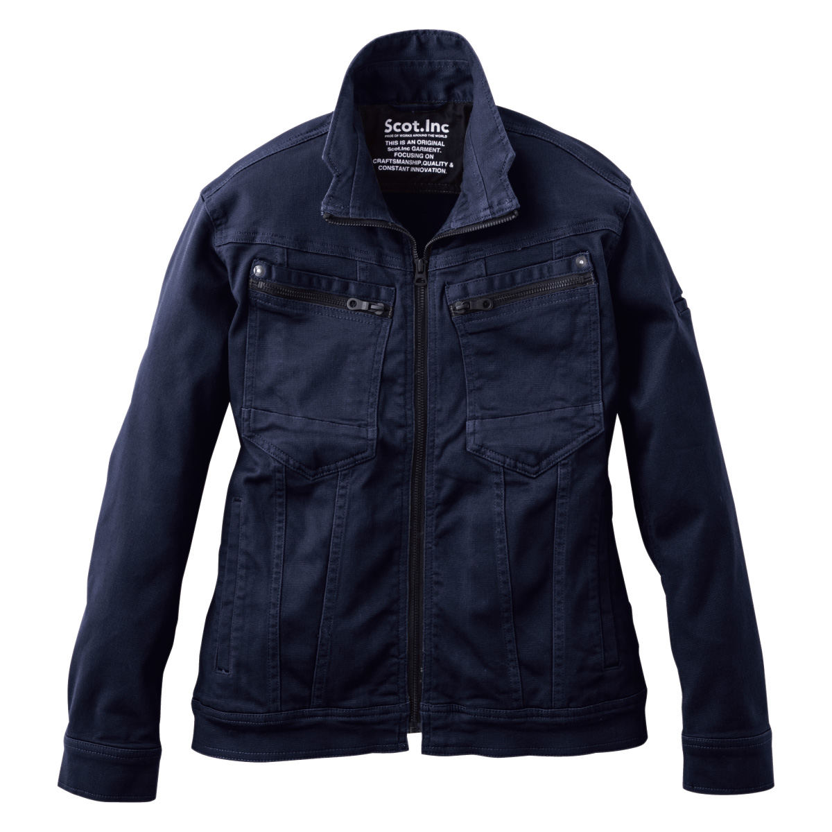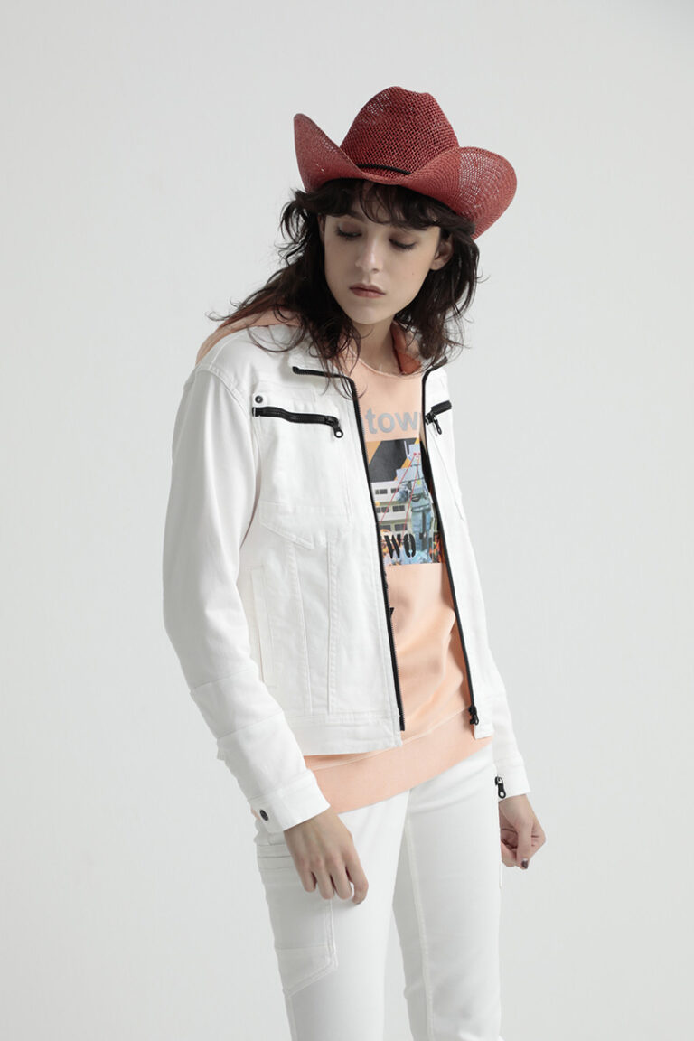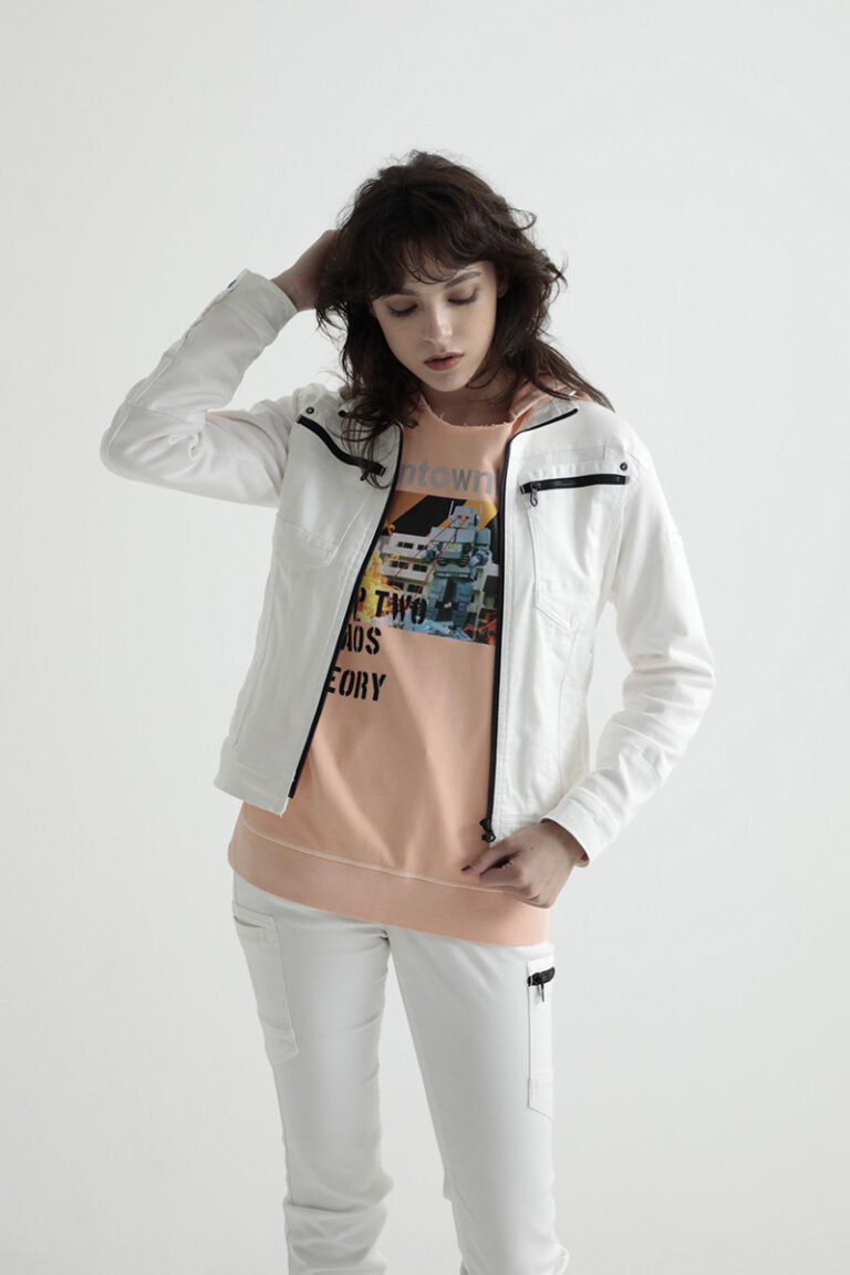 ニットデニムのような伸縮性を持った生地で作られたジャケット。ドビー織りを採用することにより、光沢感と独特の風合いをもつスタイルと、肌触りが柔らかく快適な着心地を生み出しました。