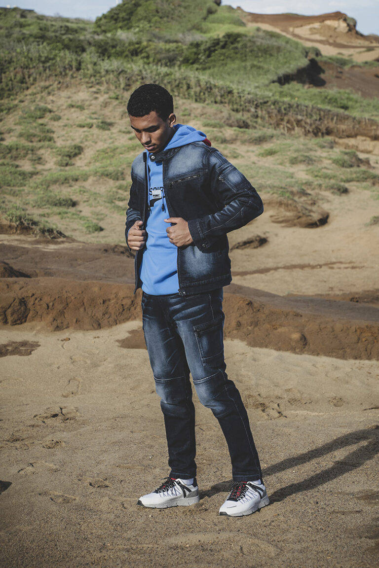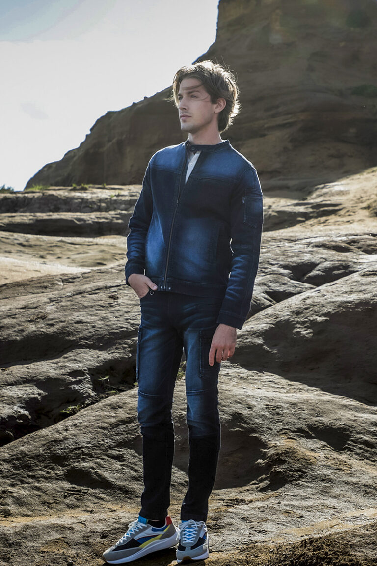 綿100%の本格的なデニムの風合いを持ちながら、着用時の快適性をそのままに高い耐久性を実現。I・デニムでは、初めから経年変化が楽しめる加工とし、M・ブルーでは色落ち加工のない深い藍色とすることで、自分自身で経年変化を楽しむことができる。